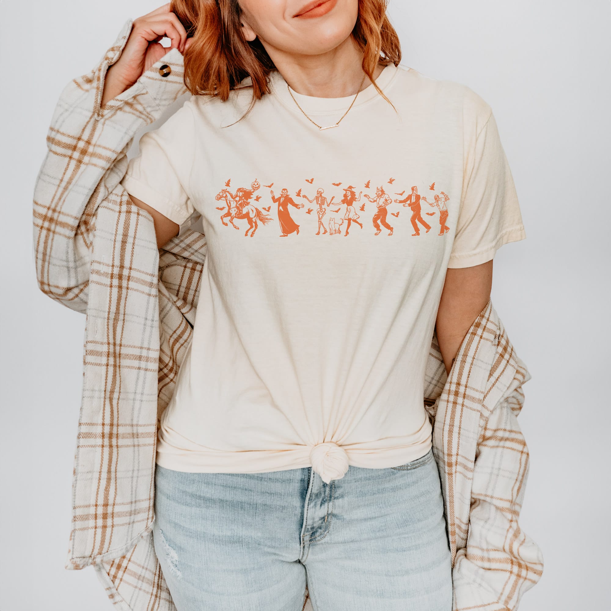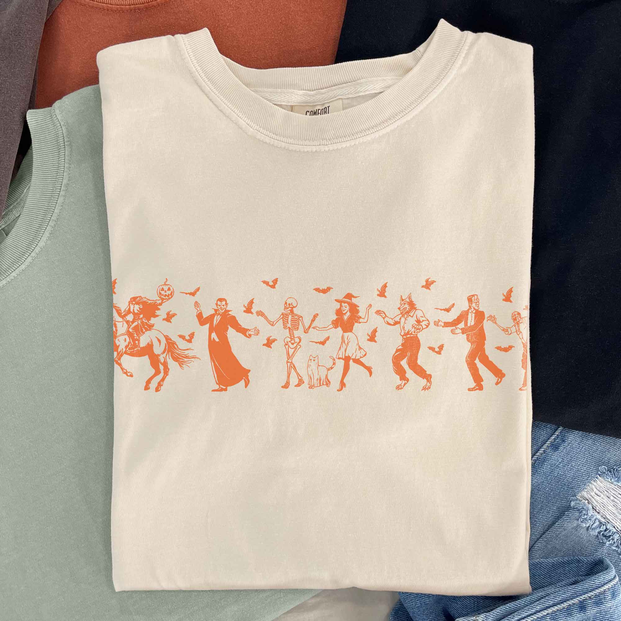 What’s more fun than Halloween?.. A Halloween Monster Parade T-Shirt! An iconic spooky crew marches across this shirt in vintage style; a headless horseman, vampire, skeleton, ghost, witch, ware wolf, monster and a mummy. An ultra comfy, heavy weight tee that won’t pill, yes please! Spooky fans agree, for a festive Fall fix, this is simply the best tee.