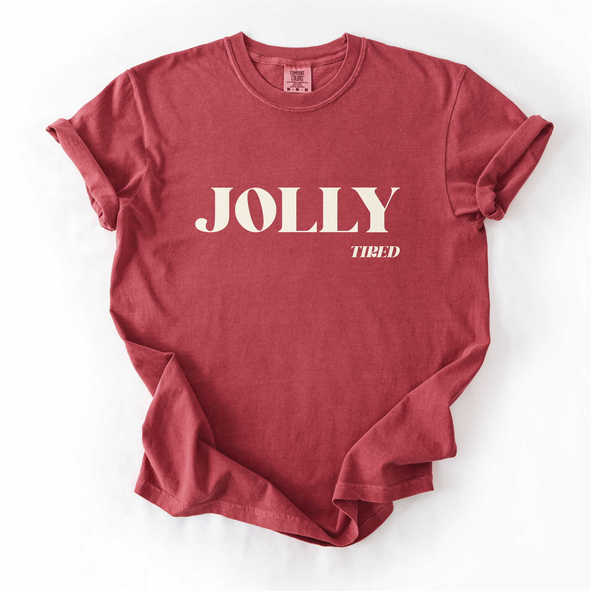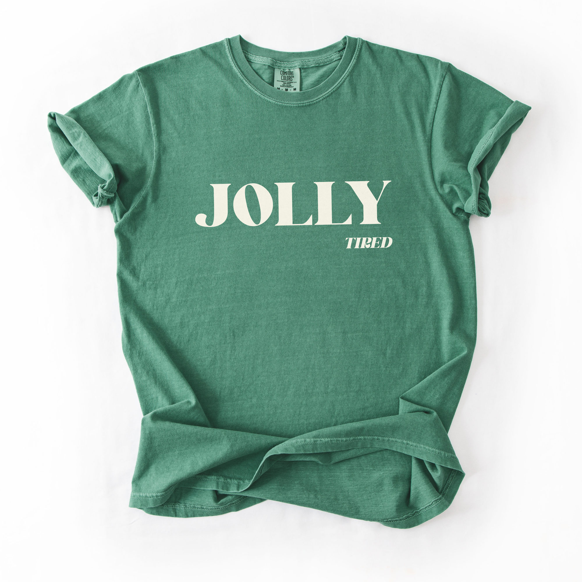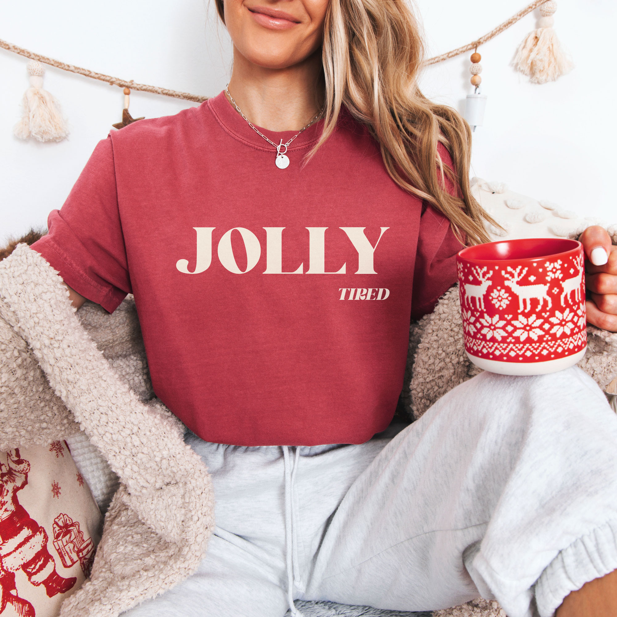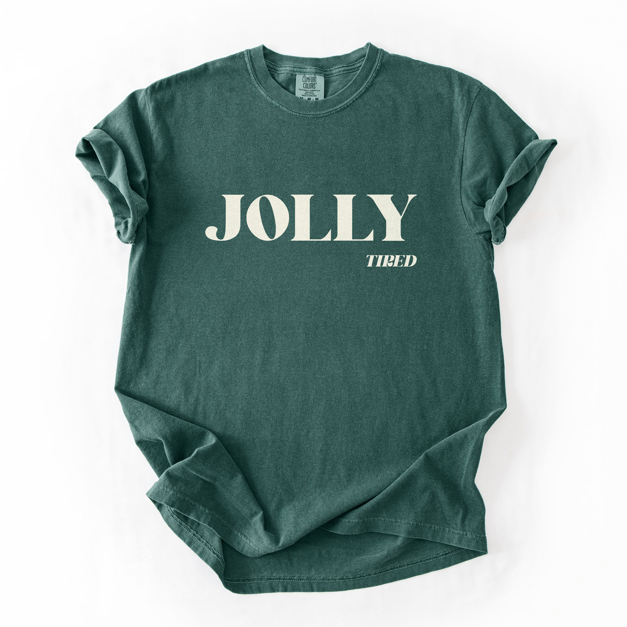 Introducing the Jolly Tired T-Shirt by Peculiar People Designs! Garment dyed for a lived-in vintage look, this cute Christmas shirt for women offers the perfect blend of comfort and style to keep you going, through the holiday season.